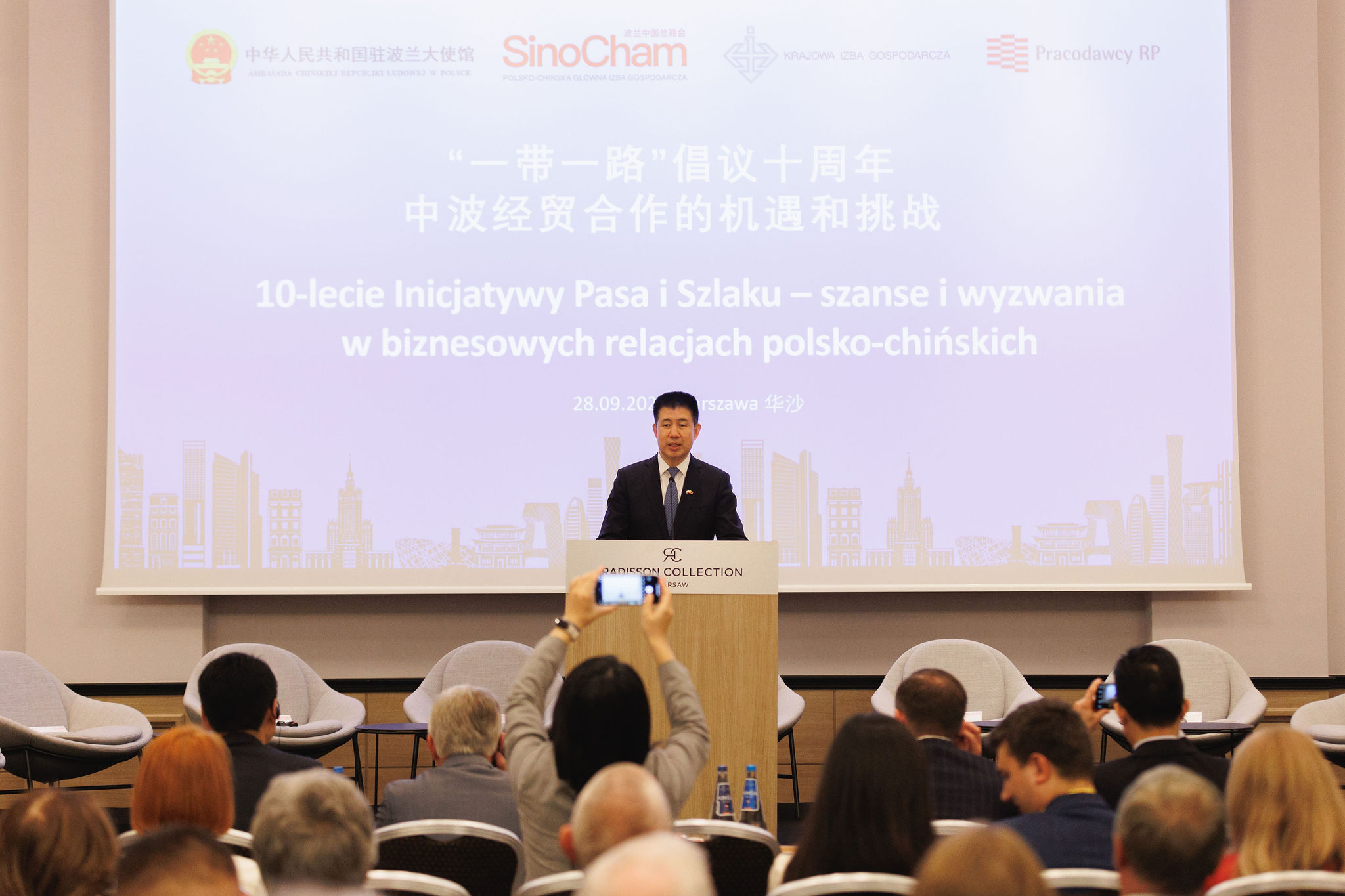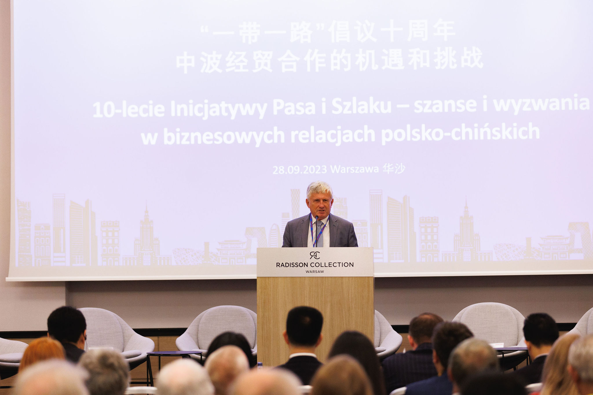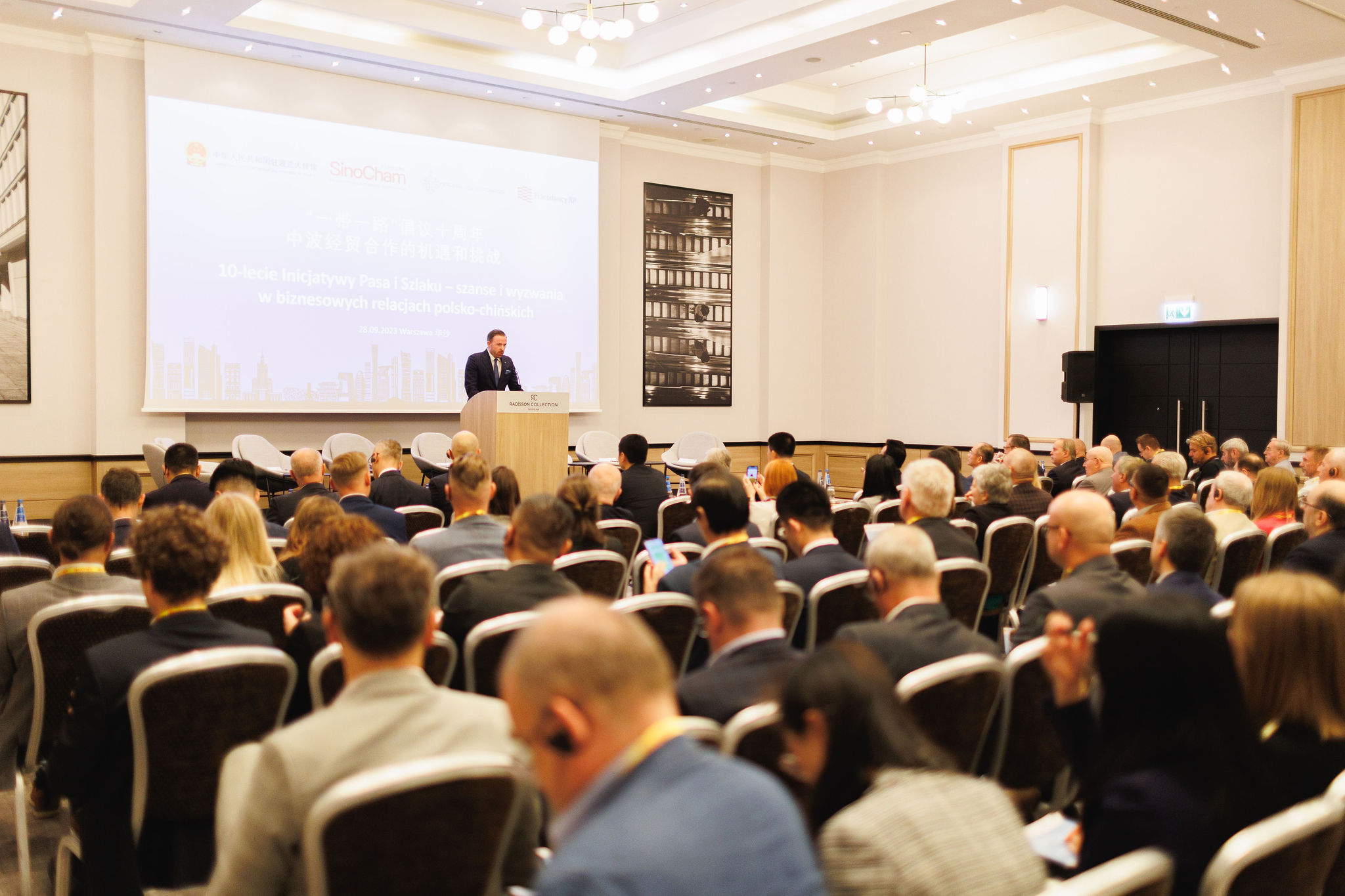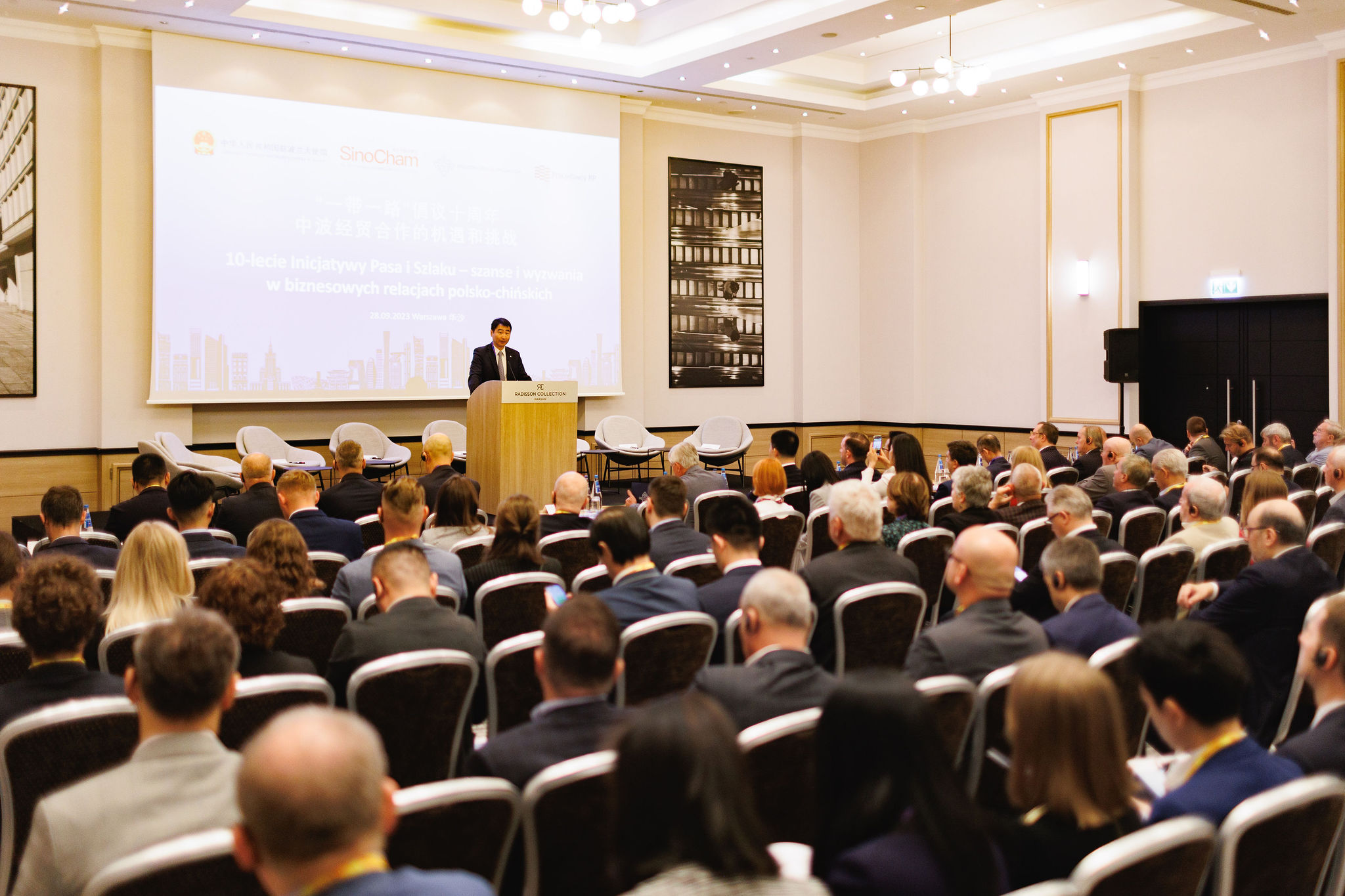 2023年9月28日,波兰中国总商会与中国驻波兰大使馆、波兰国家商会、波兰雇主协会共同举办主题为“一带一路十周年,中波经贸合作的机遇和挑战”研讨会,中国驻波兰大使孙霖江、波兰国家商会会长克沃奇科、波兰雇主协会副会长切波拉克、波兰中国总商会会长胡新元等在研讨会上发表讲话。中国驻波兰大使馆公使衔经济商务参赞徐晓峰、波兰雇主协会首席经济专家索波莱夫斯基、波兰千禧银行首席经济师马里舍夫斯基、波兰中小企业协会主席,华沙PTAK展览公司董事长施布瓦、波兰华星集团董事长毕克、波兰安永事务所市场与发展部总监波罗热克、中国工商银行华沙分行总经理刘红星等讨论嘉宾围绕研讨会主题进行了广泛热烈的讨论交流。来自波兰工商界和政府部门的一百三十余名代表出席本次研讨会。中国贸促会驻波兰代表处首席代表、波兰中国总商会秘书长郭培东主持研讨会。