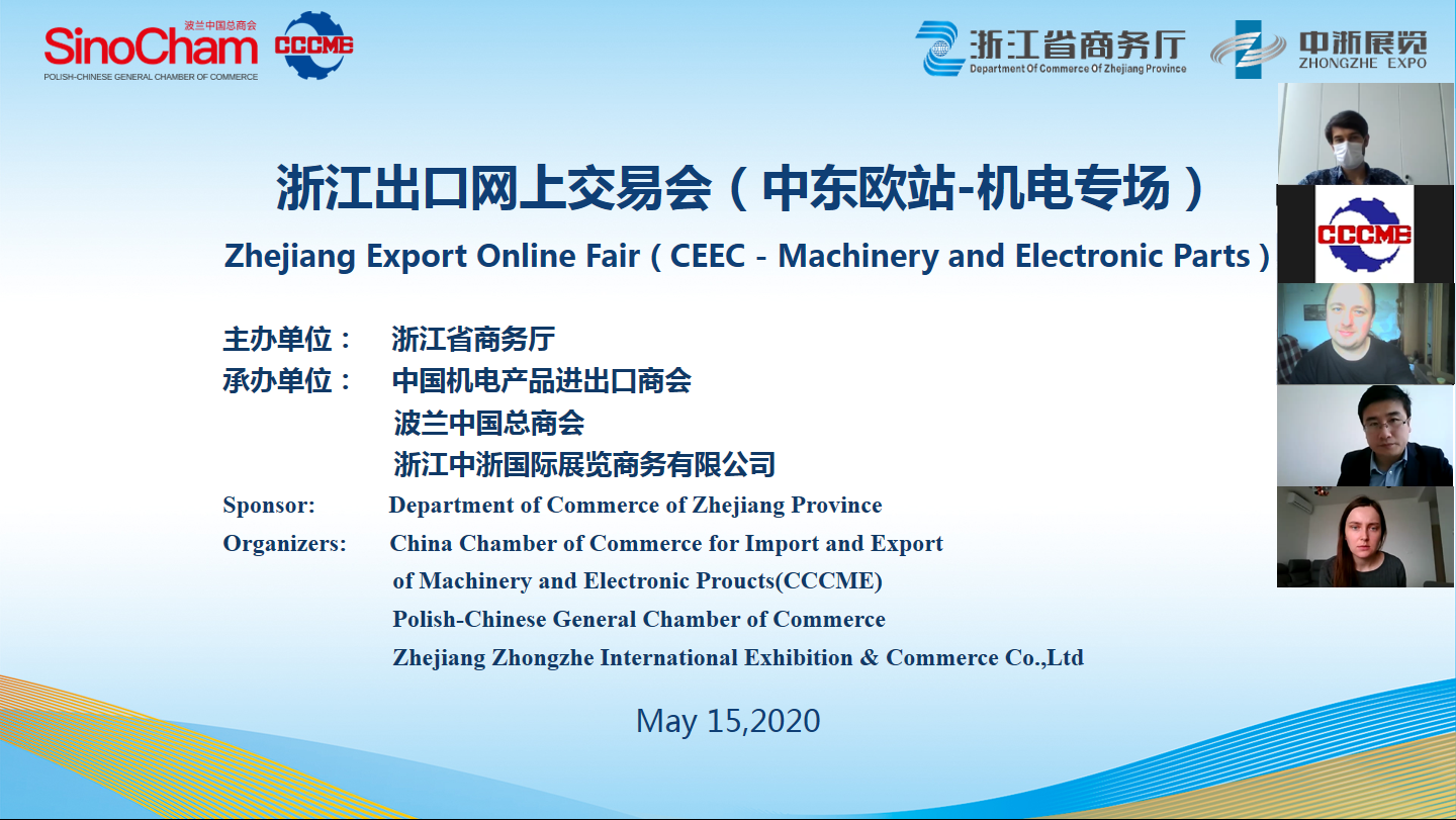 W dniach 13 i 15 maja odbyło się Zhejiang Export Online Fair 2020, wydarzenie zorganizowane było wspólnie przez Departament Handlu prowincji Zhejiang, Polsko-Chińską Główną Izbę Gospodarczą oraz Chińską Izbę Handlową ds. Importu i Eksportu maszyn i produktów elektronicznych (Zhejiang Zhongzhe Int'l Exhibition & Commerce Co., Ltd.). W spotkaniu online wzięło udział ponad 40 polskich i chińskich firm.